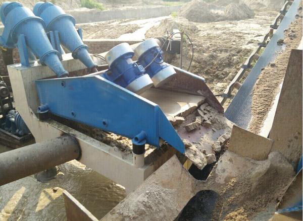 泵漿砂水混合物輸送至泥砂分離器,離心分級濃縮的細(xì)砂經(jīng)沉砂嘴提供給振動篩,經(jīng)振動篩脫水后,細(xì)砂與水有效分離,少量細(xì)砂、泥等經(jīng)返料箱再回到清洗槽,清洗槽液面過高時(shí),經(jīng)出料口排出。直線振動篩回收物料重量濃度為70%-85%。調(diào)節(jié)細(xì)度模數(shù)可以通過改變泵轉(zhuǎn)速、改變砂漿濃度、調(diào)節(jié)溢流水量、更換出砂漿嘴來實(shí)現(xiàn)。從而完成清洗、脫水和分級三種功能。